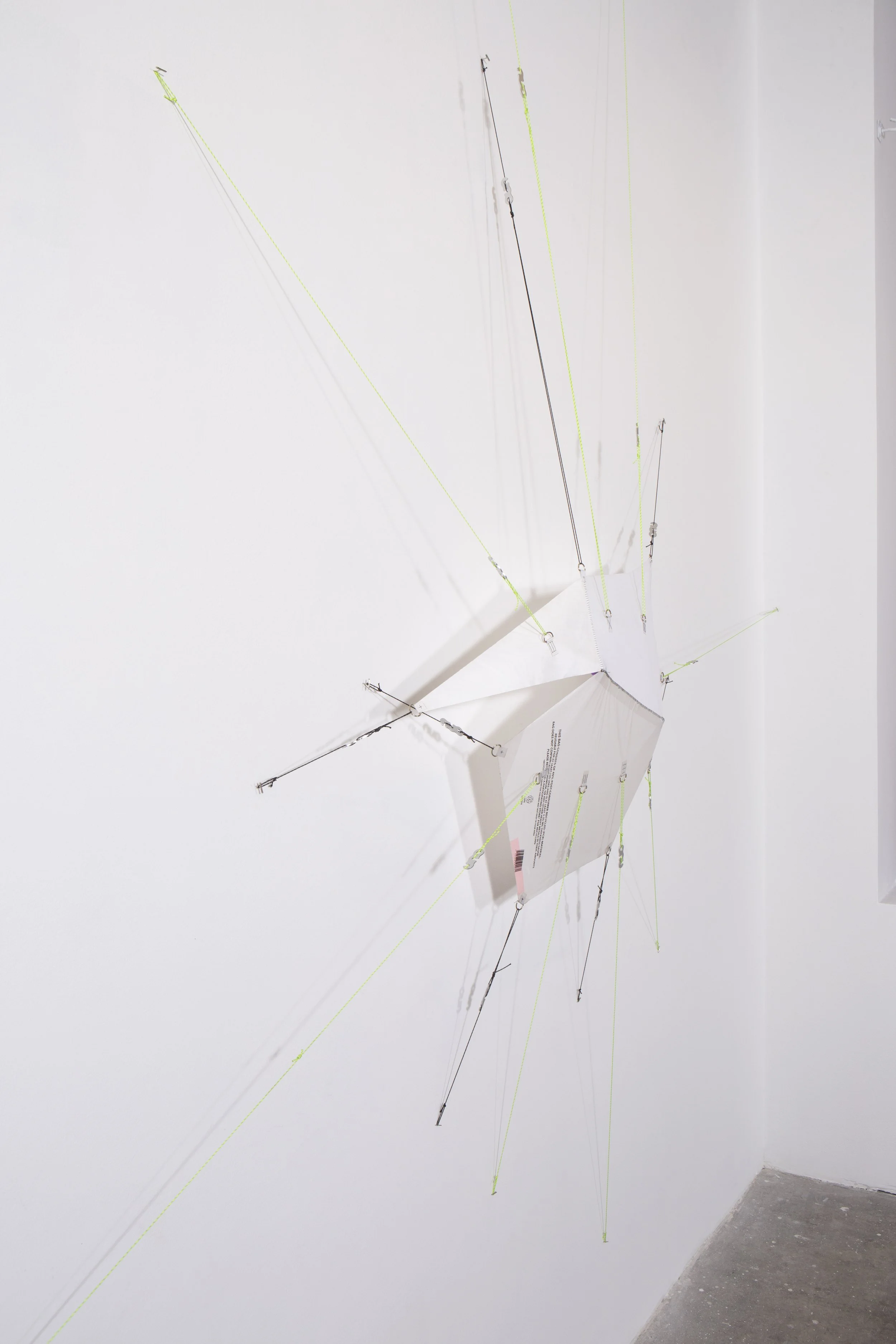 Plastic grocery bags, polyester ripstop fabric, Tyvek, 1mm reflective paracord, aluminum rope tensioners, T-pins